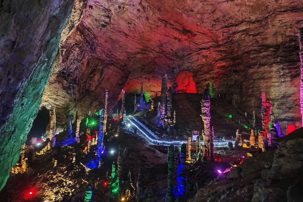 来到黄龙洞洞口,就像是拉开了一扇巨大的冰柜门,阵阵凉意扑面而来。进入溶洞,神秘的响水河,千奇百怪的钟乳石,和五光十色的灯光组成了一个光怪陆离的世界。