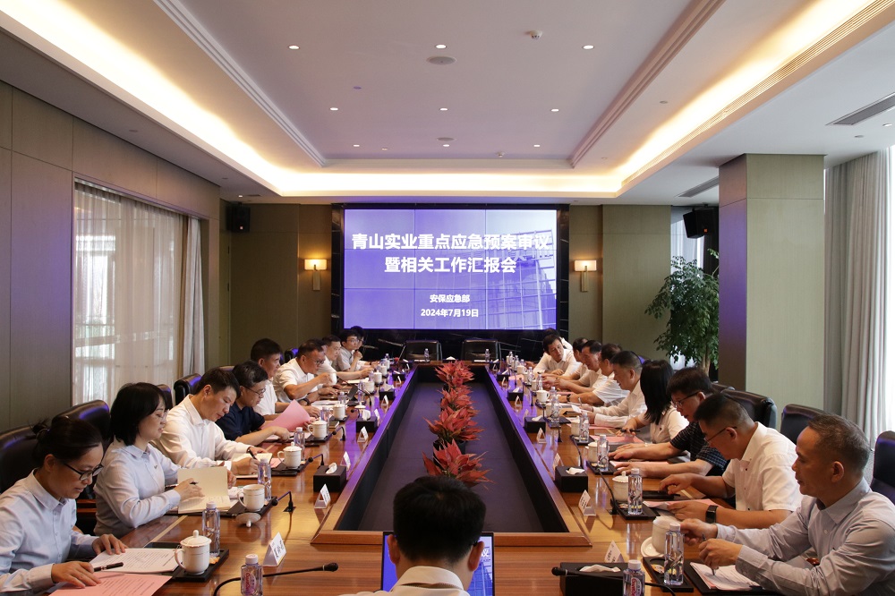 为推进青山应急预案编制修订工作,7月19日上午,青山实业董事局监察安全委员会安保应急部组织召开了《青山实业突发公共事件总体应急预案》审议会。董事局黄德余、孙建芬、张宪明等领导,青拓集团、瑞浦兰钧、吉瑞公司以及信拓公司、鼎森控股等企业相关领导出席会议。